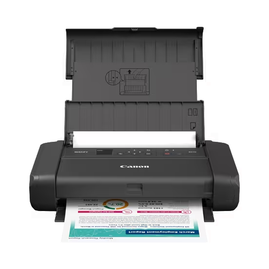 Canon Pilli MAXIFY BX110, mobil çalışan profesyoneller ve sahada baskı ihtiyacı olan kullanıcılar için geliştirilmiş, dahili şarj edilebilir pile sahip taşınabilir bir inkjet yazıcıdır. USB Type-C bağlantısı üzerinden araçta, ofiste veya evde kolayca şarj edilebilir. Kompakt yapısı, kablosuz bağlantı seçenekleri ve Canon’un gelişmiş baskı teknolojileri sayesinde her ortamda yüksek kaliteli ve güvenilir baskı sunar.